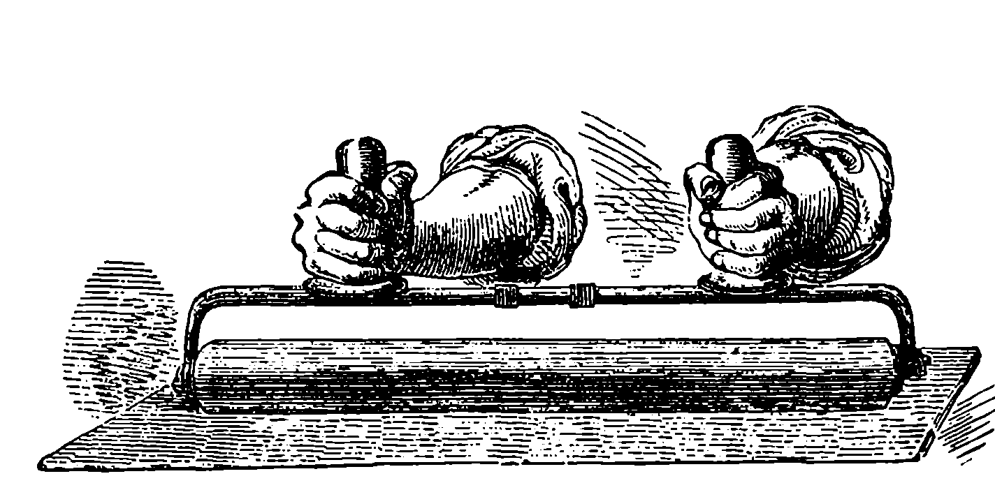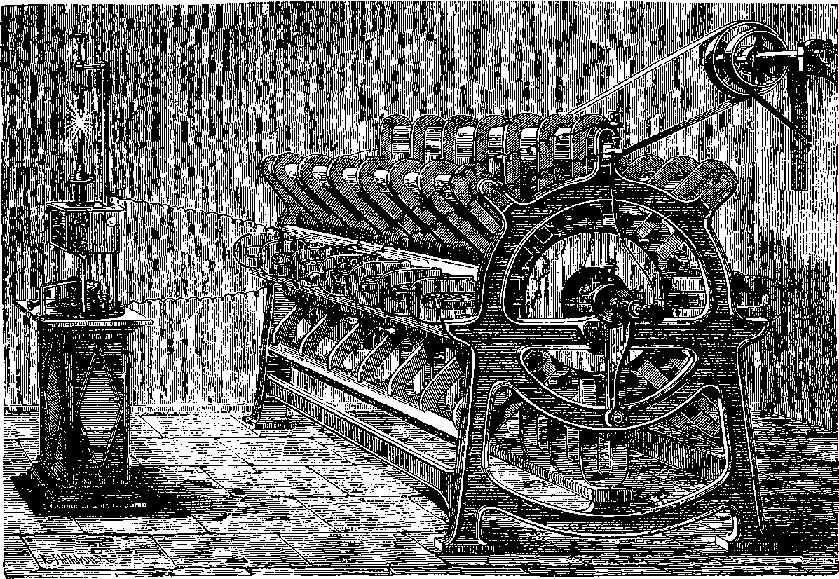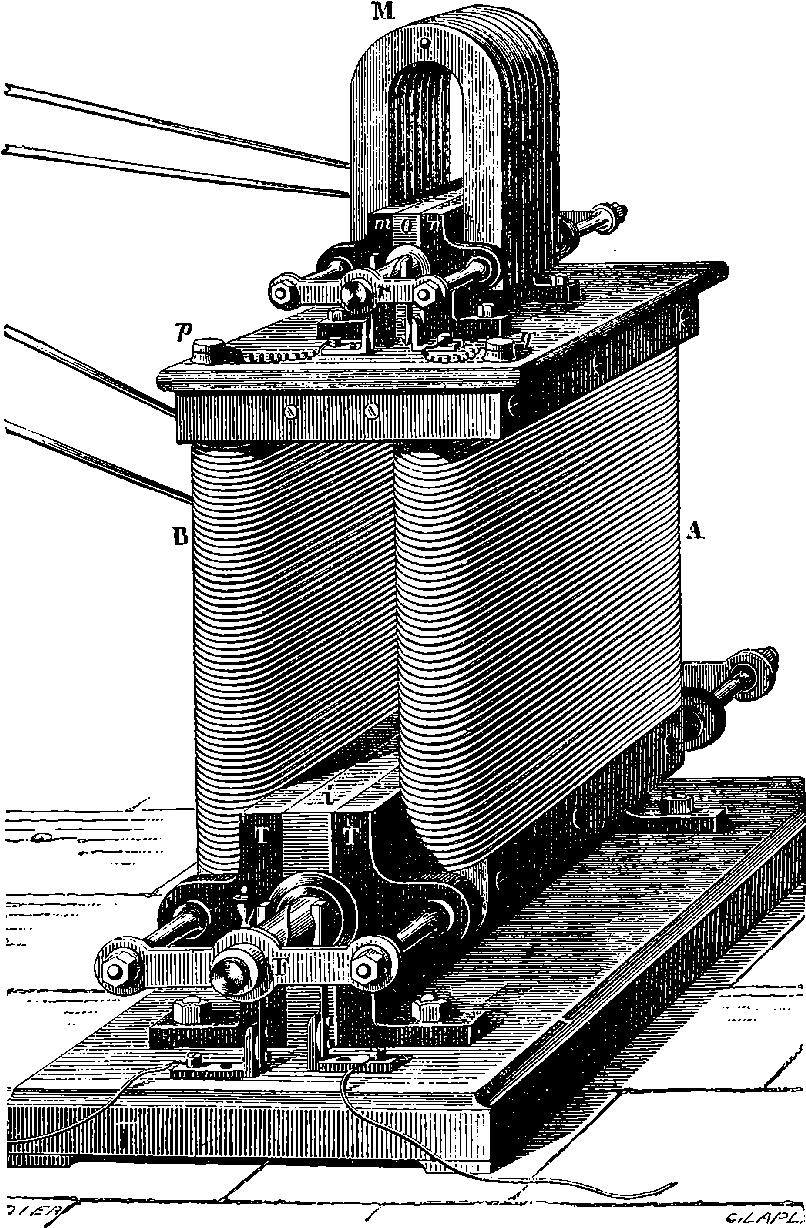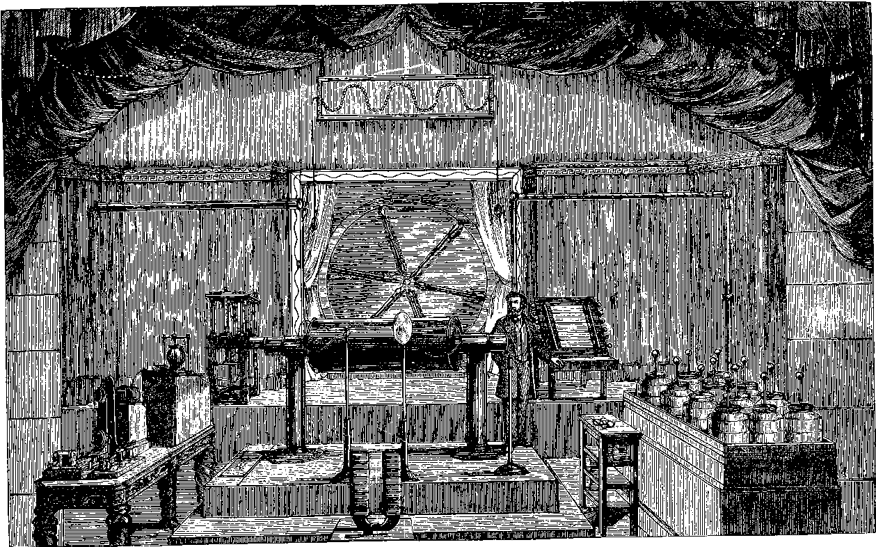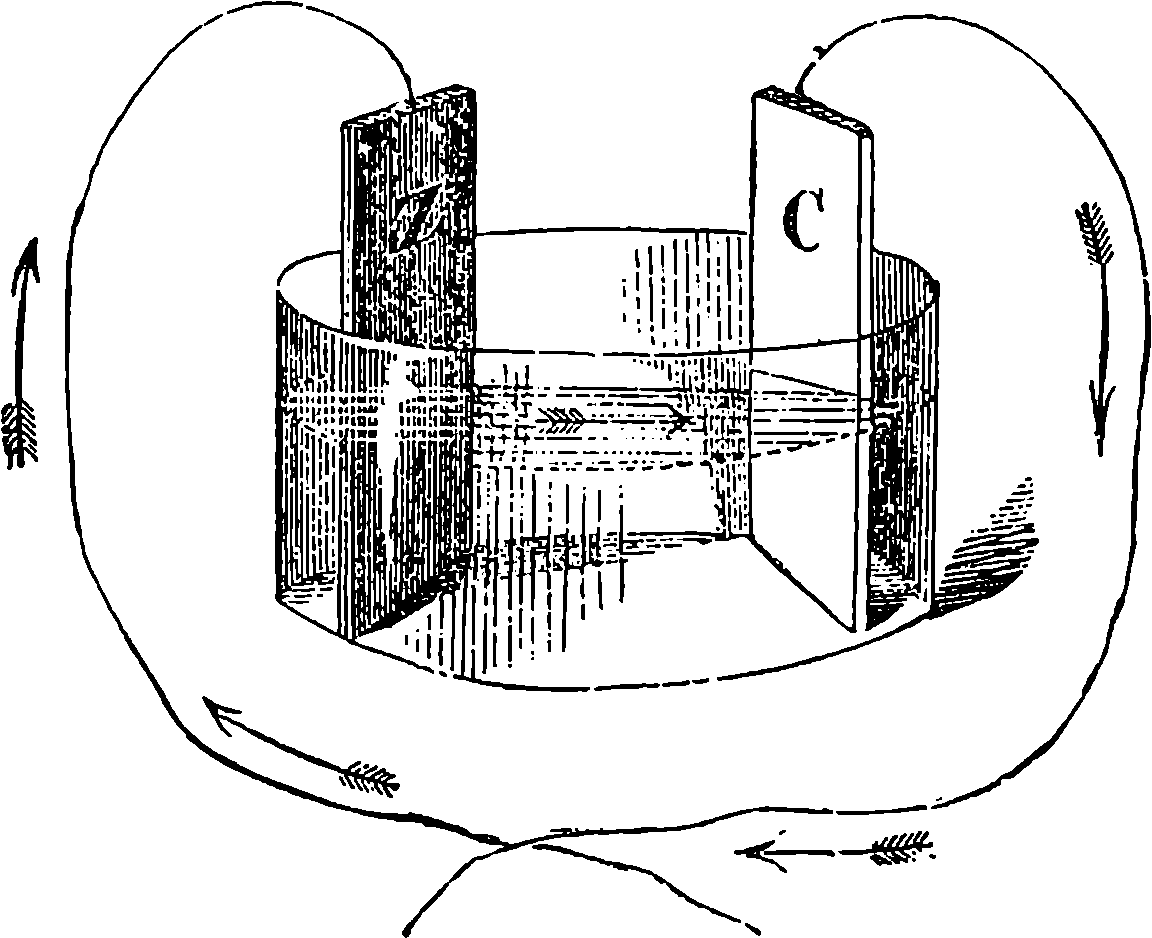 Perhaps the first step should be to point out the fact of the various forces of nature—mechanical action, heat, light, electricity, magnetism, chemical action—being so related that any one can be made to produce all the rest directly or indirectly. Some examples of the conversion of one form of force into another occur in the foregoing pages. Thus, on page 485 an experiment is described in which electricity produces a mechanical action; electricity is also shown, on page 496, to produce heat; on page 491 chemical action; on page 501 magnetism. Then, as instances of the inverse actions, there is on page 488, in the first paragraph on “Electric Induction,” an account of the mode in which mechanical movements may give rise to electricity; and in the experiments in pages 508, 509, and particularly in the account of the Gramme machine, page 511, it is shown how mechanical movements can, through magnetism, produce electricity. The voltaic element, page 491, and the galvanic batteries, are instances of chemical action supplying electricity. On page 518 a striking instance is mentioned of changes in the forms of force. Every lighted candle is a case of chemical action giving rise to light; and interesting examples of the inverse relation are referred to on page 608. On page 168 is represented the conversion of arrested motion into heat and light. We have, indeed, sufficient examples to arrange a series of these conversions of forces in a circle. Thus, chemical action (oxidation in the animal system) supplies muscular power, this sets in motion a Gramme machine, the motion is converted into electricity, the electricity produces the electric light, and light causes chemical action, and with this the cycle is complete. In the steam engine heat is converted into mechanical force, and many cases will present 804themselves to the reader’s mind in which mechanical actions give rise to heat. The doctrine of a mutual dependence and convertibility among all the forms of force was first definitively taught in England by Mr. (now Justice) Grove, in 1842; and almost simultaneously Dr. Meyer promulgated similar views in Germany. Mr. Grove subsequently embodied his doctrine in a treatise, called “The Correlation of the Physical Forces,” which has seen several editions.