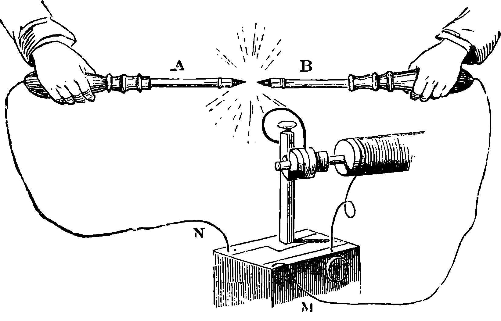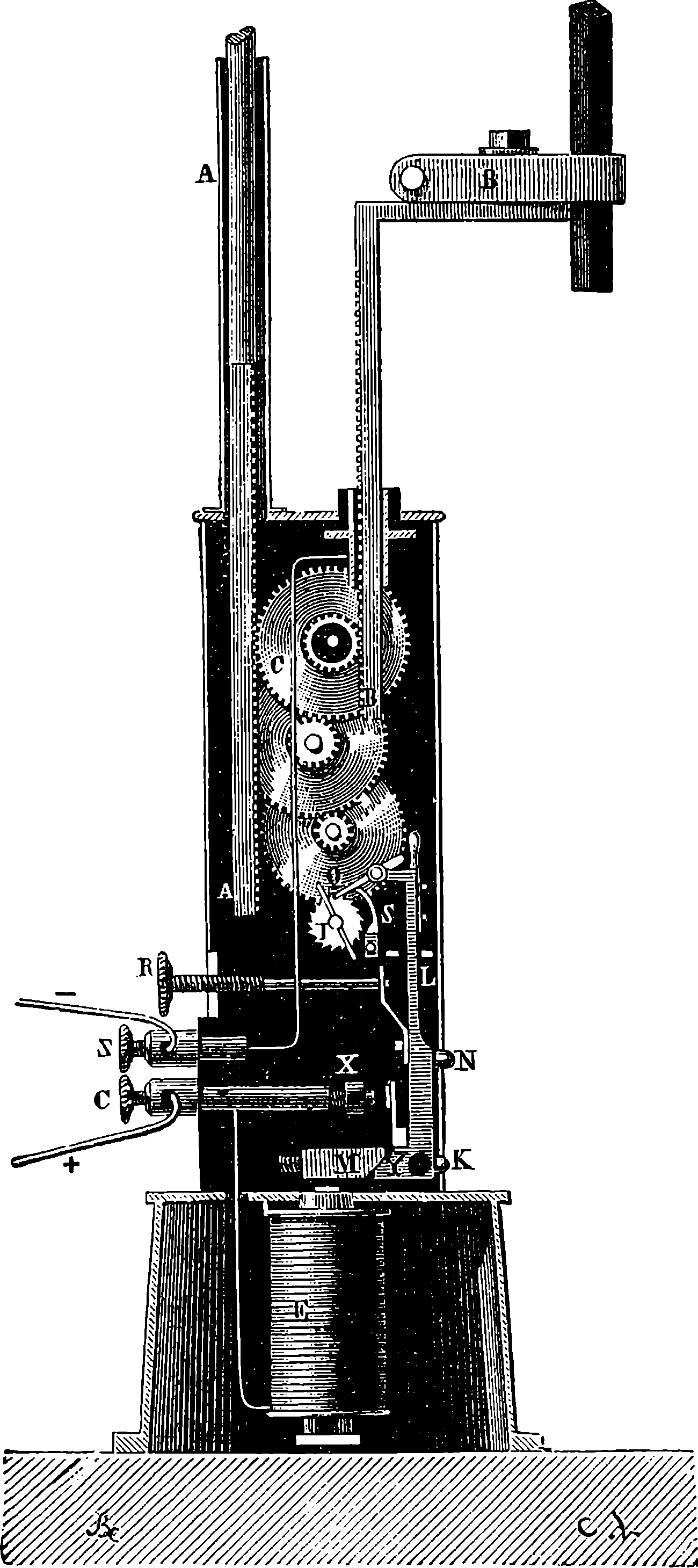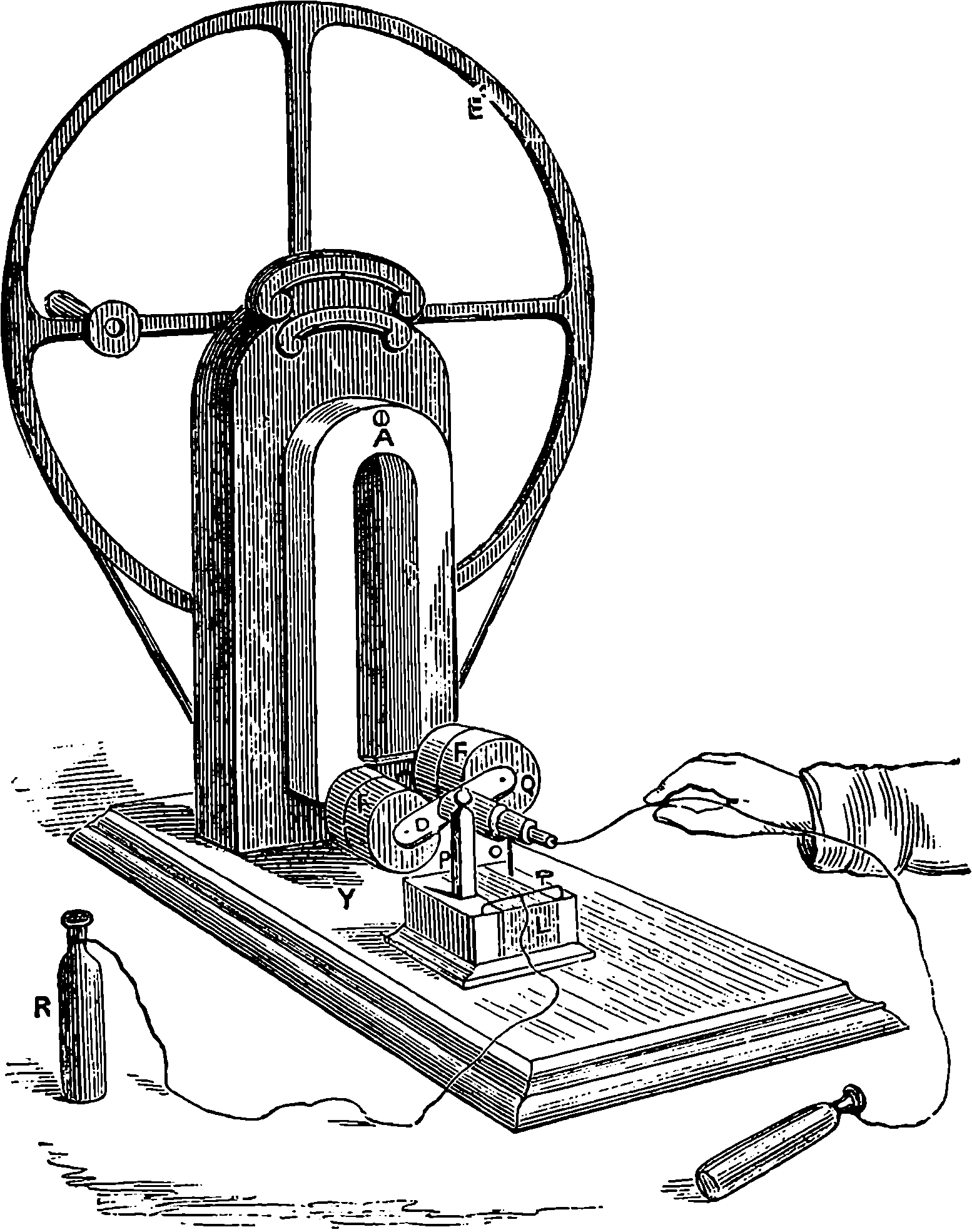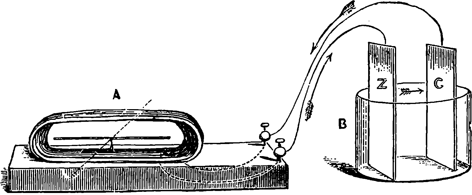 Perhaps the first step should be to point out the fact of the various forces of nature—mechanical action, heat, light, electricity, magnetism, chemical action—being so related that any one can be made to produce all the rest directly or indirectly. Some examples of the conversion of one form of force into another occur in the foregoing pages. Thus, on page 485 an experiment is described in which electricity produces a mechanical action; electricity is also shown, on page 496, to produce heat; on page 491 chemical action; on page 501 magnetism. Then, as instances of the inverse actions, there is on page 488, in the first paragraph on “Electric Induction,” an account of the mode in which mechanical movements may give rise to electricity; and in the experiments in pages 508, 509, and particularly in the account of the Gramme machine, page 511, it is shown how mechanical movements can, through magnetism, produce electricity. The voltaic element, page 491, and the galvanic batteries, are instances of chemical action supplying electricity. On page 518 a striking instance is mentioned of changes in the forms of force. Every lighted candle is a case of chemical action giving rise to light; and interesting examples of the inverse relation are referred to on page 608. On page 168 is represented the conversion of arrested motion into heat and light. We have, indeed, sufficient examples to arrange a series of these conversions of forces in a circle. Thus, chemical action (oxidation in the animal system) supplies muscular power, this sets in motion a Gramme machine, the motion is converted into electricity, the electricity produces the electric light, and light causes chemical action, and with this the cycle is complete. In the steam engine heat is converted into mechanical force, and many cases will present 804themselves to the reader’s mind in which mechanical actions give rise to heat. The doctrine of a mutual dependence and convertibility among all the forms of force was first definitively taught in England by Mr. (now Justice) Grove, in 1842; and almost simultaneously Dr. Meyer promulgated similar views in Germany. Mr. Grove subsequently embodied his doctrine in a treatise, called “The Correlation of the Physical Forces,” which has seen several editions.