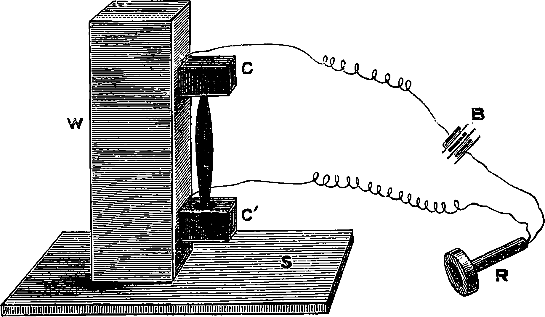 Since, then, all the forces with which we are acquainted are expressible (though the exact relations of some have yet to be discovered) in terms of work, it is found of great advantage to consider the power of doing work as the common measure of doing all these. Thus, if we define energy as that which does, or that which is capable of doing, work, we have a term extremely convenient in the description of some aspects of our subject. Thus we can now speak of the energies of nature, instead of the forces. And all forces, active or passive, may be summed up in one word—energy. And, further, the great discovery of the conservation of forces under definite equivalents, may be summed up very briefly in this statement—THE AMOUNT OF ENERGY IN THE UNIVERSE IS CONSTANT. To make this statement clear requires that a distinction between two forms of every kind of energy be pointed out. To recur to the example before imagined: if you carry the 1 lb. weight up the Monument, and deposit it on the ledge at the top, it might lie there for a thousand years before it was made to give back the work you had performed upon it. That work has been, in a manner, stored up by the position you have given to your weight. Now, in taking up the weight, you expended energy—you really performed work: that is an instance of energy in operation, and may be termed “actual energy.” In what form does the energy exist during the thousand years we may suppose your weight to lie at the top of the Monument? It is ready to yield up your work again at any moment it is permitted to descend, and it possesses therefore during the whole period a potential energy equal in amount to the actual energy you bestowed upon it. A similar distinction between actual and potential energy exists with regard to every form of force. If by any means you separate an atom of carbon from an atom of oxygen, you exert actual energy. The process is analogous to carrying up the weight. The atoms when separated possess potential energy,—they can rush together again, like the weight to the earth, and in doing so will give out the work which was expended on their separation. A parallel illustration might be drawn from electrical force.
