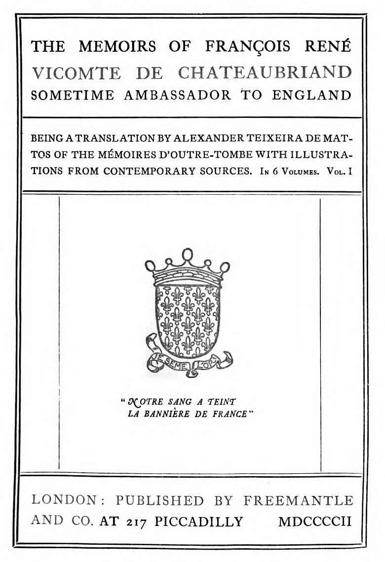 I found one at almost the first asking, and it will ever remain a mystery to me why no complete translation of this admirable work has seen the light in England during the more than fifty years that have elapsed since the Mémoires d'outre-tombe were first published.