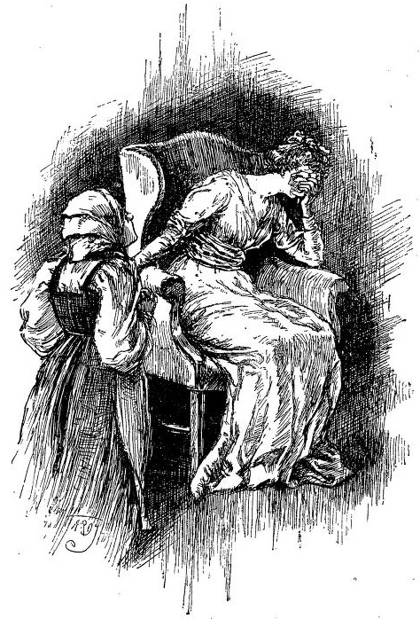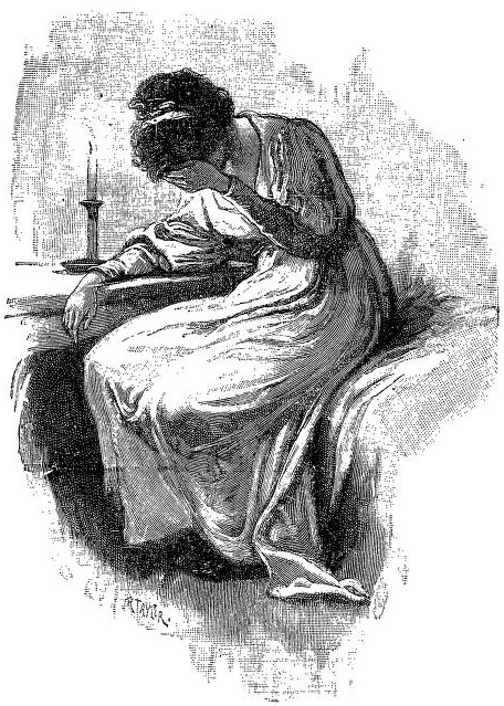 She entered, dropped on her knees by his side, and after lifting a couple of spoonfuls to his mouth, leant her cheek against his. He caressed and patted her head.