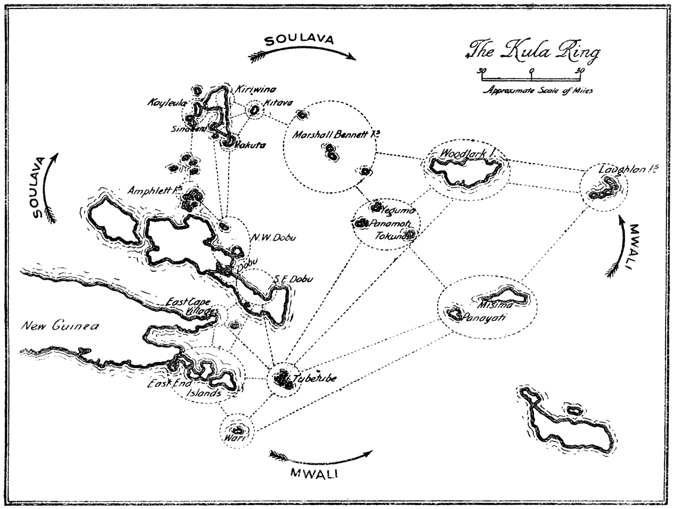 Further East, on the South coast, there lives the industrious, sea-faring population of the Mailu, who link the East End of New Guinea with the central coast tribes by means of annual trading expeditions.2 Finally, the natives of the islands and archipelagoes, scattered around the East End, are in constant trading relations with one another. We possess in Professor Seligman’s book an excellent description of the subject, especially of the nearer trades routes between the various islands inhabited by the Southern Massim.3 There exists, however, another, a very extensive and highly complex trading system, embracing with its ramifications, not only the islands near the East End, but also the Louisiades, Woodlark Island, the Trobriand Archipelago, and the d’Entrecasteaux group; it penetrates into the mainland of New Guinea, and exerts an indirect influence over several outlying districts, such as Rossel Island, and some parts of the Northern and Southern coast of New Guinea. This trading system, the Kula, is the subject I am setting out to describe in this volume, and it will be seen that it is an economic phenomenon of considerable theoretical importance. It looms paramount in the tribal life of those natives who live within its circuit, and its importance is fully realised by the tribesmen themselves, whose ideas, ambitions, desires and vanities are very much bound up with the Kula.