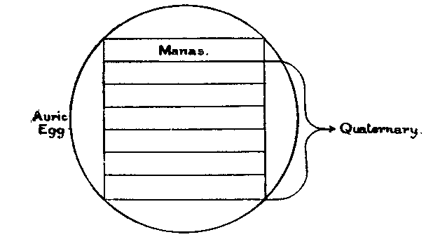 At reincarnation the Higher Ego shoots out a Ray, the Lower Ego. [pg 591] Its energies are upward and downward. The upward tendencies become its Devachanic experiences; the lower are Kâmic. The Higher Manas stands to Buddhi as the Lower Manas to the Higher.