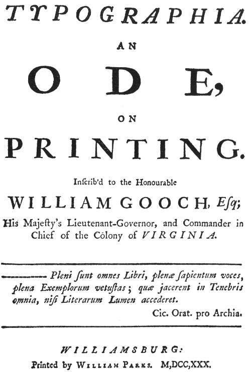 Before 1730, however, a more tolerant attitude had developed. With the permission of Governor William Gooch, the English-born William Parks moved that year from Annapolis to Williamsburg, which had succeeded Jamestown as the capital of Virginia in 1699. He was designated public printer of Virginia, at an annual salary of £120 a year, eventually increased to £280. Parks continued to print the acts of the Virginia Assembly, which he had begun several years before in Maryland, and soon advertised for subscriptions for a proposed Virginia Miscellany “at his House, near the Capitol, in Williamsburg.” Before the year was out he had printed several works, at least five of which are known by title. One of these is an ode to printing, Typographia, by one “J. Markland,” which salutes Gooch for his encouragement of printing. In the high-flown style of its day, the ode concludes: