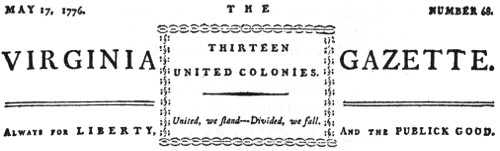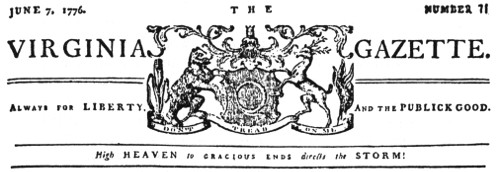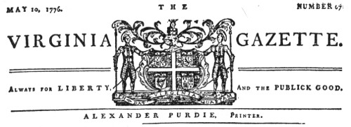 Masthead of Purdie’s VIRGINIA GAZETTE before the adoption of the Virginia Resolution for American Independence on May 15, 1776, by the Virginia Convention of Delegates meeting at the Capitol in Williamsburg.