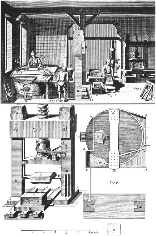 A paper mill. Here are shown the operations involved in making a sheet of paper in the eighteenth century. (1) The vatman dipping the deckle and screen into a vat of paper pulp. (2) The coucher removing the deckle and pressing the freshly formed sheet of paper on felt. (3) Preparing the new paper for pressing. (4) A rack for stacking wet sheets of paper prior to their being pressed. (5) Details of the paper press. (6) Details of the vat. DIDEROT.