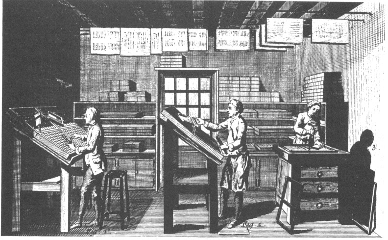 A view of a typical eighteenth-century printer’s composing room. Here type was set by hand to be printed on the press. (1) Setting type in a composing stick. (2) Transferring a stick of set type to a galley. (3) Planing a type form by beating lightly on the type surface with a block of wood and a mallet. DIDEROT.