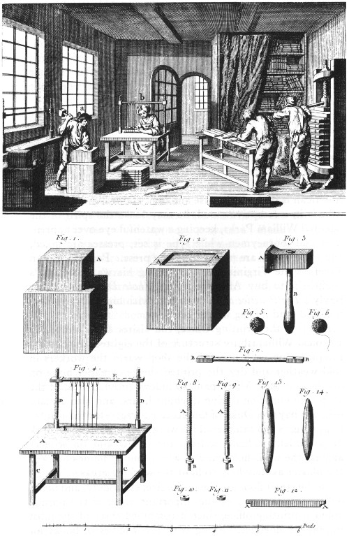 A bookbindery. In this view, several important binding operations can be seen. (a) Beating folded sections of a book so that they will lie flat. (b) Stitching folded sections to the heavy cords that hold the book together. (c) Trimming the edges of a freshly sewn book on a ploughing press. (d) Pressing freshly bound books in a large standing press. BELOW. (1-3) The blocks and hammer used by the binder. (4) The sewing frame. (5-6) Twine. (7-12) Parts of the sewing frame. (13-14) Wood or bone folders. DIDEROT.