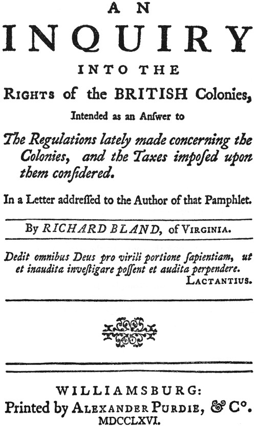 One of the most significant early tracts was Richard Bland’s An Inquiry into the Rights of the British Colonies, printed by Alexander Purdie in March 1766. Writing in the aftermath of the previous year’s fiery Stamp Tax debates, Bland vigorously proclaimed his belief in Locke’s doctrines of natural rights and natural law. Reprinted in London, Bland’s tract was evidence of the mounting sentiment for self-rule in the colonies. Bland’s Inquiry was also a memorial to its author, a man who devoted much of his life to public service. An aged delegate to Virginia’s first state legislature in October 1776, Bland collapsed in the Williamsburg streets on his way to a session, and died hours later in the home of his friend, John Tazewell.