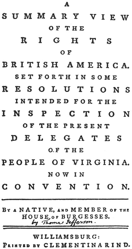 The most important pamphlet printed in Williamsburg was A Summary View of the Rights of British America, from the pen of Thomas Jefferson. Lying ill up-country in August of 1774, when Virginia’s legislators were convened in Williamsburg to send off delegates for the First Continental Congress, Jefferson wrote his tract to suggest instructions that might guide these delegates at Philadelphia.