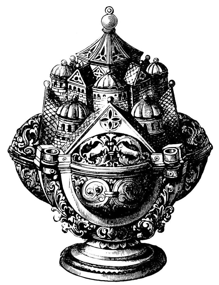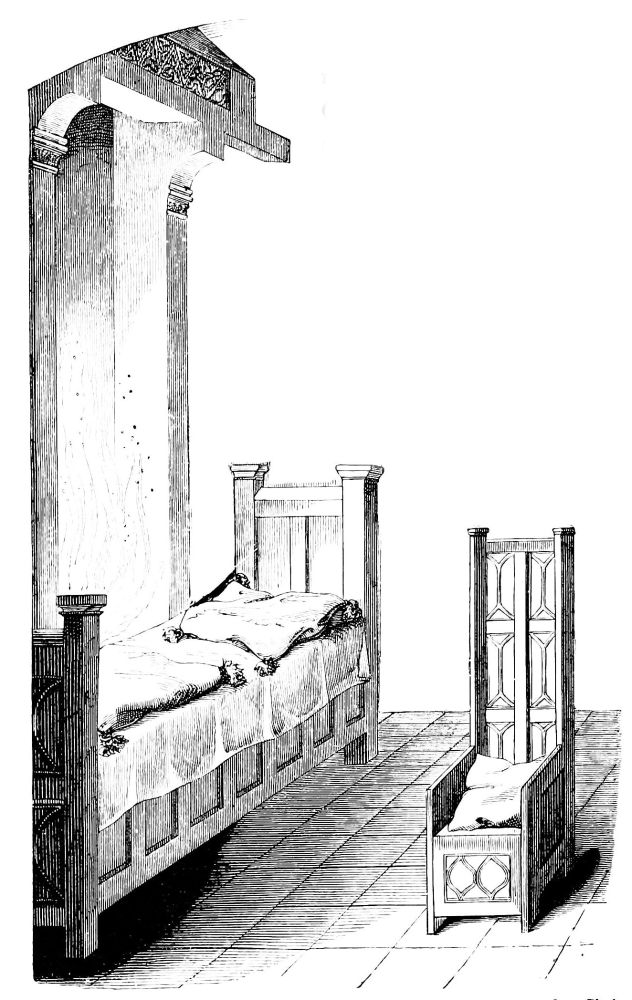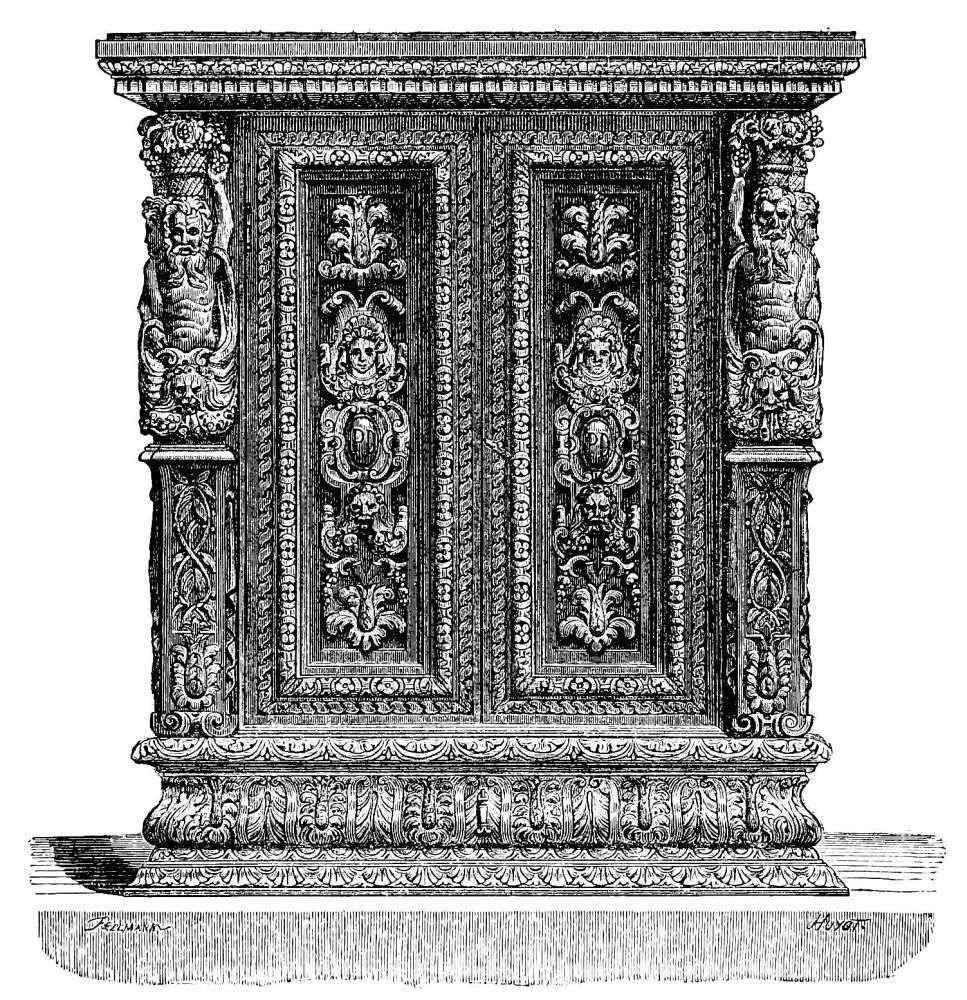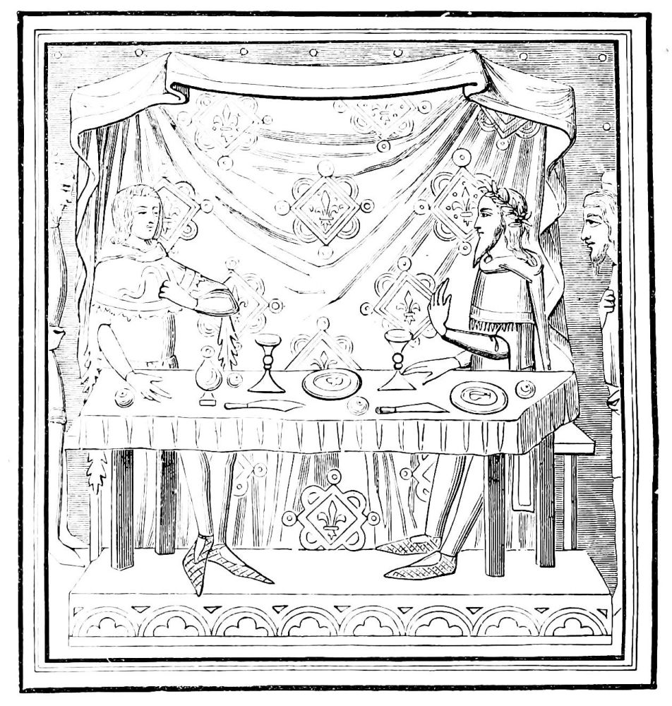 | Simplicity of Furniture among the Gauls and Franks.—Introduction of costly taste in articles of Furniture of the Seventh Century.—Arm-chair of Dagobert.—Round Table of King Artus.—Influence of the Crusades.—Regal Banquet in the time of Charles V.—Benches.—Sideboards.—Dinner Services.—Goblets.—Brassware.—Casks.—Lighting.—Beds.—Carved-wood Furniture.—Locksmith’s Work.—Glass and Mirrors.—Room of a Feudal Seigneur.—Costliness of Furniture used for Ecclesiastical Purposes.—Altars.—Censers.—Shrines and Reliquaries.—Gratings and Iron-mountings. | ||