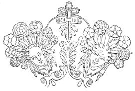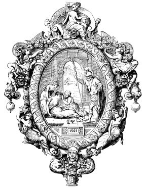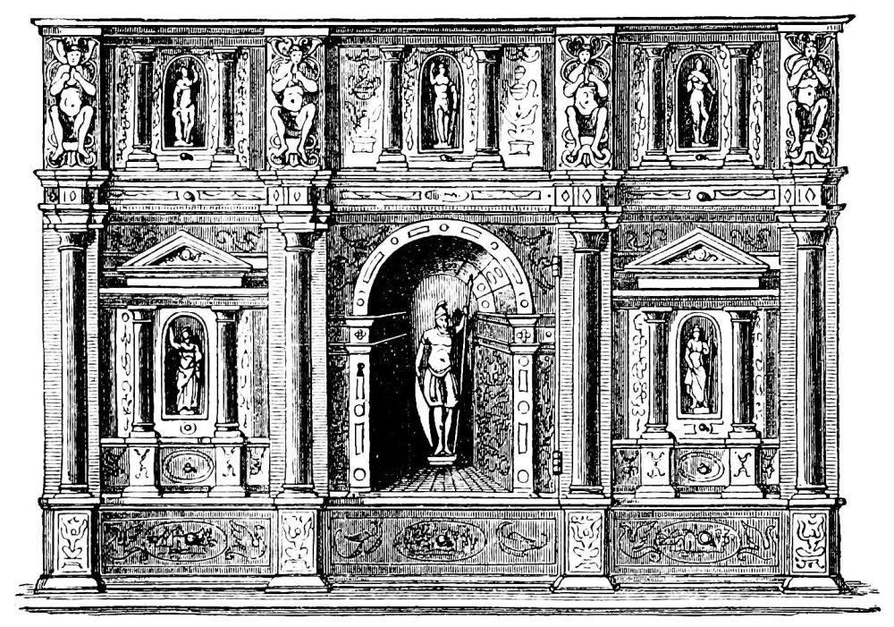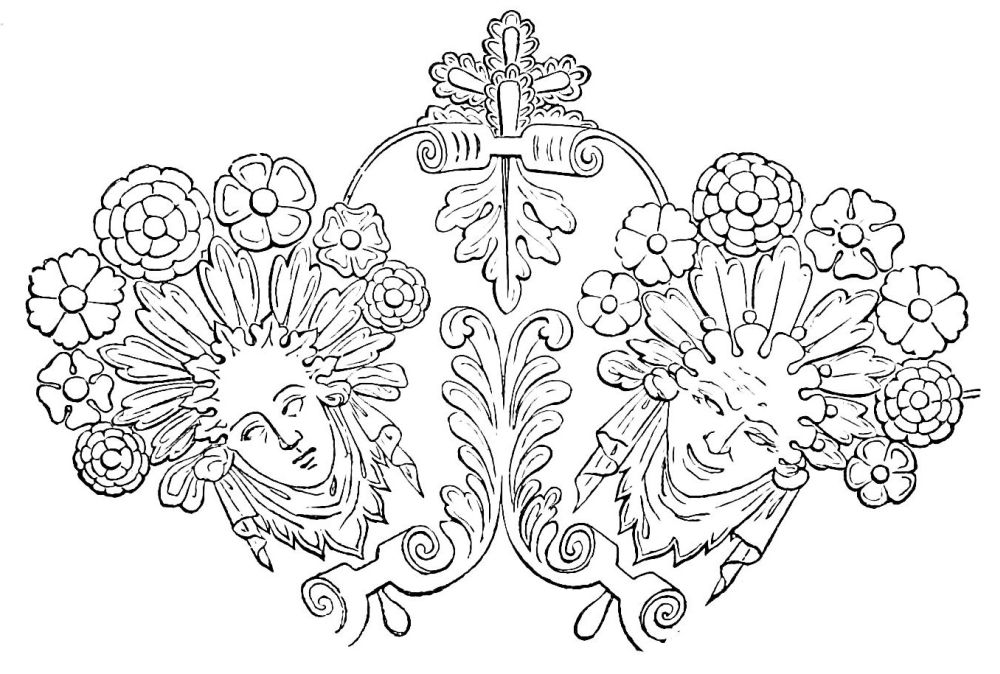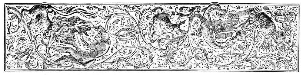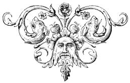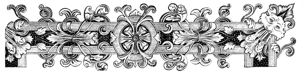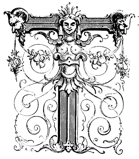 Fig. 415.—Border employed by John of Tournes, in 1557, ornamented with Antique Masks and Allegorical Personages bearing Baskets containing Laurel Branches.