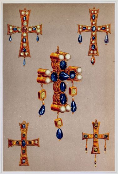 | Its Antiquity.—The Trésor de Guarrazar.—The Merovingian and Carlovingian Periods.—Ecclesiastical Jewellery.—Pre-eminence of the Byzantine Goldsmiths.—Progress of the Art consequent on the Crusades.—The Gold and Enamels of Limoges.—Jewellery ceases to be restricted to Purposes of Religion.—Transparent Enamels.—Jean of Pisa, Agnolo of Siena, Ghiberti.—Great Painters and Sculptors from the Goldsmiths’ Workshops.—Benvenuto Cellini.—The Goldsmiths of Paris. | ||