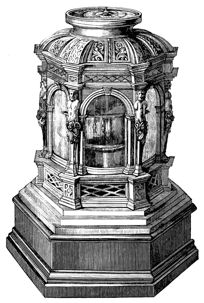 | Modes of measuring Time among the Ancients.—The Gnomon.—The Water-Clock.—The Hour-Glass.—The Water-Clock, improved by the Persians and by the Italians.—Gerbert invents the Escapement and the moving Weights.—The Striking-bell.—Maistre Jehan des Orloges.—Jacquemart of Dijon.—The first Clock in Paris.—Earliest portable Timepiece.—Invention of the spiral Spring.—First appearance of Watches.—The Watches, or “Eggs,” of Nuremberg.—Invention of the Fusee.—Corporation of Clockmakers.—Noted Clocks at Jena, Strasburg, Lyons, &c.—Charles-Quint and Jannellus.—The Pendulum. | ||