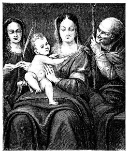 [35] Giorgione studied under Giovanni Bellini, younger brother of Gentile, and son of Jacopo. M. Lacroix does not even mention Giovanni Bellini, though he is generally esteemed before his father and brother, besides being the master of two of the greatest painters of the Venetian school, Titian and Giorgione; who, however, soon cast aside the antiquated style of their early instructor.—[Ed.]