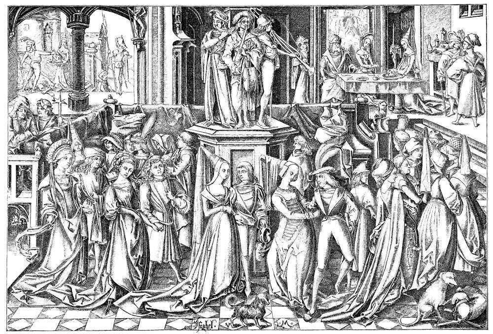 Fig. 414—“Livre d’Heures,” by Guillaume Roville (1551), a composition in the style of the school of Lyons, with Caryatides representing female Saints semi-veiled.