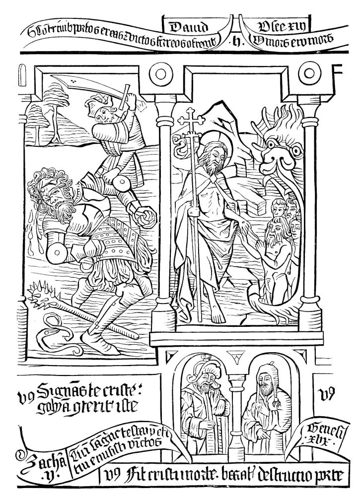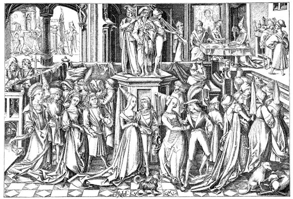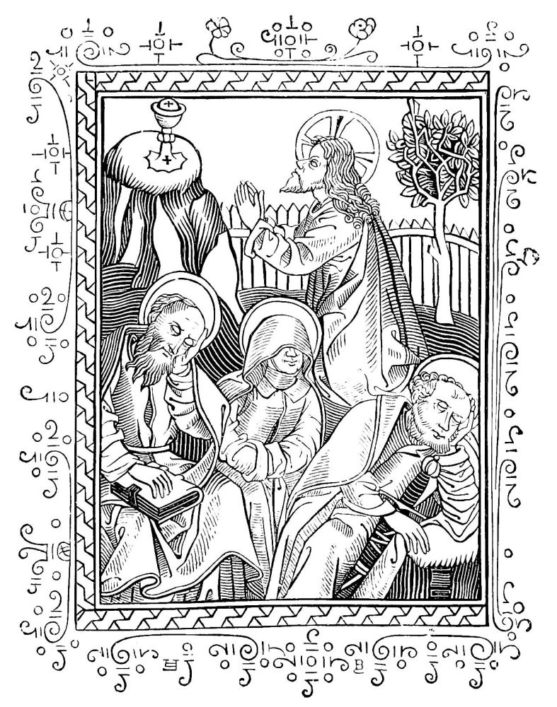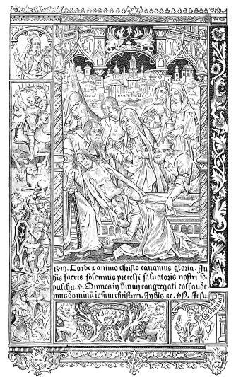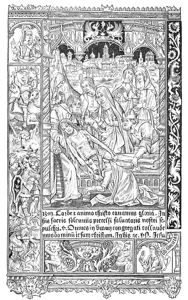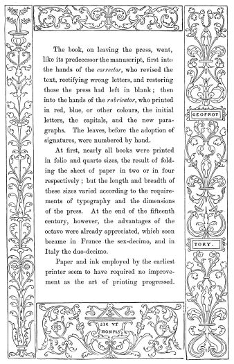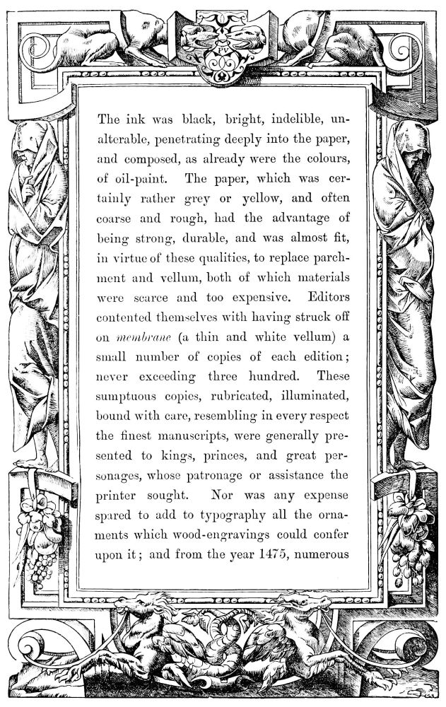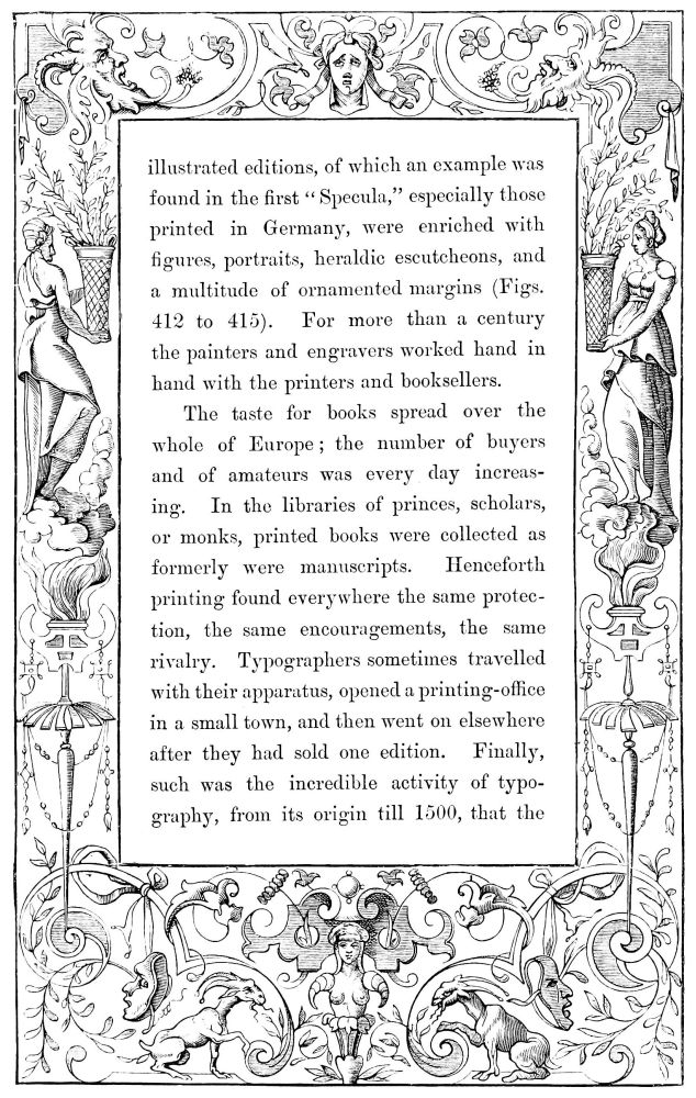 The ink was black, bright, indelible, unalterable, penetrating deeply into the paper, and composed, as already were the colours, of oil-paint. The paper, which was certainly rather grey or yellow, and often coarse and rough, had the advantage of being strong, durable, and was almost fit, in virtue of these qualities, to replace parchment and vellum, both of which materials were scarce and too expensive. Editors contented themselves with having struck off on membrane (a thin and white vellum) a small number of copies of each edition; never exceeding three hundred. These sumptuous copies, rubricated, illuminated, bound with care, resembling in every respect the finest manuscripts, were generally presented to kings, princes, and great personages, whose patronage or assistance the printer sought. Nor was any expense spared to add to typography all the ornaments which wood-engravings could confer upon it; and from the year 1475, numerous{519} illustrated editions, of which an example was found in the first “Specula,” especially those printed in Germany, were enriched with figures, portraits, heraldic escutcheons, and a multitude of ornamented margins (Figs. 412 to 415). For more than a century the painters and engravers worked hand in hand with the printers and booksellers.