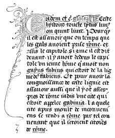 The largest number of the early editions resembled each other, for they were generally printed in Gothic characters, or lettres de somme—letters which bristled with points and angular appendices. These characters, when printing was only just invented, had preserved in Holland and in Germany{514} their original form; and the celebrated printer of Bruges, Colard Mansion, only improved on them in his valuable publications, which were almost contemporaneous with Gutenberg’s “Catholicon;” but they had already under-gone in France a semi metamorphosis in getting rid of their angularities and their most extravagant features. These lettres de somme were then adopted under the name of bâtarde (bastard) or ronde (round), in the first books printed in France, and when Nicholas Jenson established himself in Venice