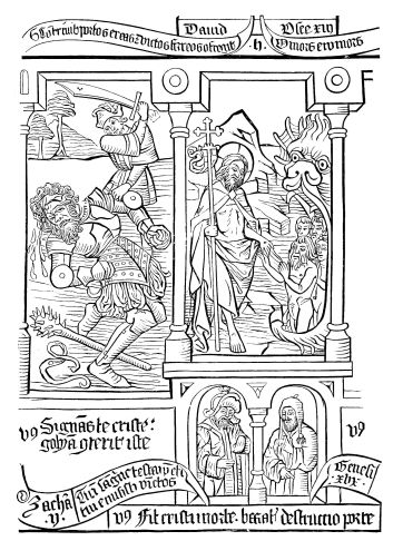 This magnificent Psalter, which went through three editions without any considerable alterations being made in it in the space of thirty-three years, is a large in-folio volume of one hundred and seventy-five leaves, printed in red and black characters, imitated from those used in the liturgical manuscripts of the fifteenth century. There exists, however, of the rarest edition of this book but six or seven copies on vellum (Fig. 396).