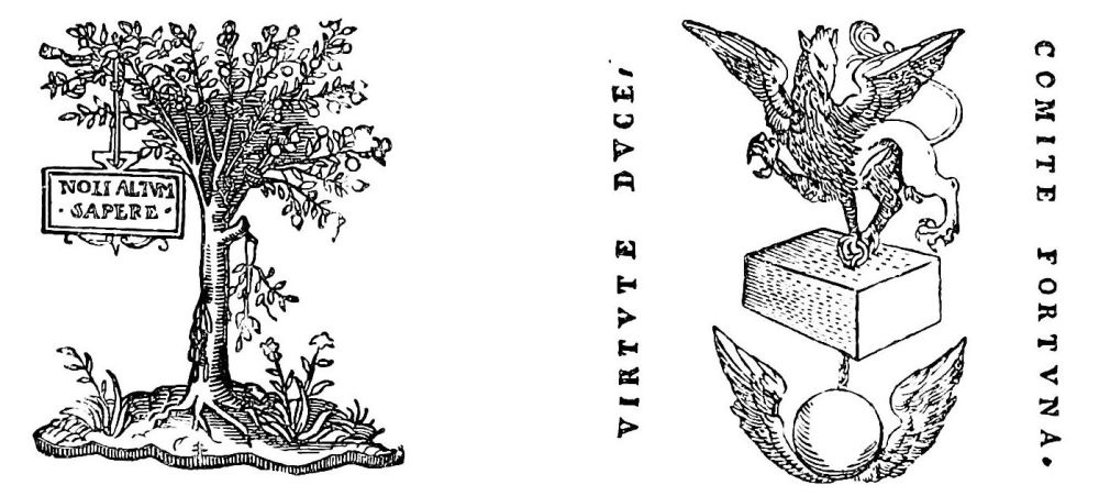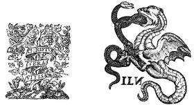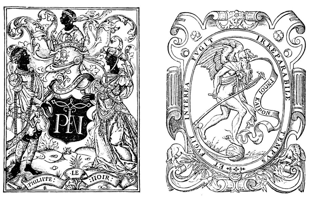 Fig. 407.—Mark of Temporal, Printer at Lyons, 1550-1559, with two devices; one in Latin, “And in the meanwhile time flieth, flieth irreparably;” the other in Greek, “Mark, or know, Time.” (Observe the play upon the words tempus, καιρὁς and Temporal.)