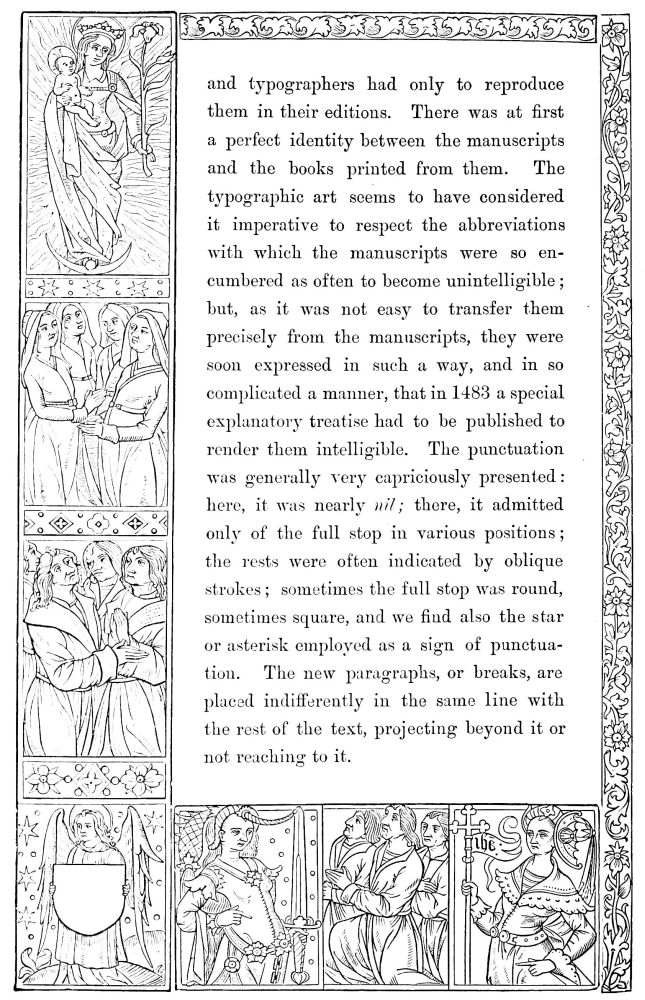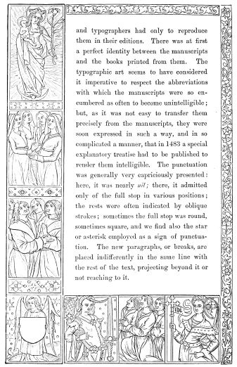 and bound together. After the register came the catchwords, which, at the end of each quire or of each leaf, were destined to serve an analogous purpose; and the signatures, indicating the place of quires or of leaves by letters or figures; but signatures and catchwords existed already in the manuscripts,{516} and typographers had only to reproduce them in their editions. There was at first a perfect identity between the manuscripts and the books printed from them. The typographic art seems to have considered it imperative to respect the abbreviations with which the manuscripts were so encumbered as often to become unintelligible; but, as it was not easy to transfer them precisely from the manuscripts, they were soon expressed in such a way, and in so complicated a manner, that in 1483 a special explanatory treatise had to be published to render them intelligible. The punctuation was generally very capriciously presented: here, it was nearly nil; there, it admitted only of the full stop in various positions; the rests were often indicated by oblique strokes; sometimes the full stop was round, sometimes square, and we find also the star or asterisk employed as a sign of punctuation. The new paragraphs, or breaks, are placed indifferently in the same line with the rest of the text, projecting beyond it or not reaching to it.