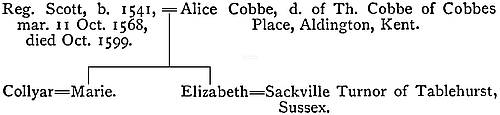 The only issue of this marriage, the only issue (that at least survived) of both his marriages—for the Maria in the table of “The Memorials” was the daughter of his second wife by her first husband—was Elizabeth, afterwards married to Sackville Turnor; and the only issue of that marriage, prior at least to Reynold’s death in 1599, was Cicely. Elizabeth’s birth must have been in or before 1574, for in the Inquis. xxpost mortem of Reg. Scot generosus in 1602, she is said to be “28 et amplius”. The Holy Maid of Kent (mentioned by Scot, p. 26) was servant to one of her maternal progenitors, probably to her grandfather.