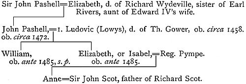 The Pashells, or Pashleys, were descended from Sir Edmund de Passelege, a Baron of the Exchequer, who purchased a manor in Smeeth in 1319; he died 1327. The family resided at Iden, Sussex; and the house there, and the manor in Smeeth, devolved on the Scots, Anne Pympe being her father’s only child. It is true that John Gower, the poet, does not mention any children in his extant will, but he was probably seventy-eight when he died; and, what is more to the purpose, his published will was probably only his testament, the will or declaration of uses of the land being commonly at xviiithat time a separate instrument. Th. Gower, of Clapham, given above as the father of Lowys, was probably the son or grandson of John Gower (see Sir Harris Nicolas in The Retrosp. Rev., 2 Ser., ii, 103-17). Also Gower the poet is known to have had property in Southwark; and Th. Gower, of Clapham, refers in his will (1458) to his tenement called The Falcon, in Southwark, near the hospital; and in Manning and Bray’s Surrey, iii, 623, there is noticed a deed of conveyance dated 22nd November 1506, of part of the site of St. Thomas’s Hospital, in Southwark, made by John Scot, of Iden, and Anne his wife, daughter and heir of John Pashley, who was cousin and heir of John Gower. It may be added as curious that Sir Robert Gower, who is believed to have been uncle to the poet, was buried in Brabourne church in 1349; his monument, now destroyed, being noticed in Weever.