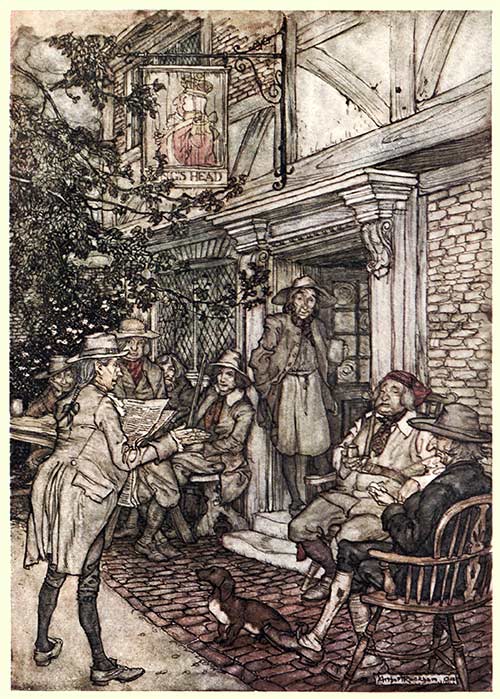 Times grew worse and worse with Rip Van Winkle as years of matrimony rolled on; a tart temper never mellows with age, and a sharp tongue is the only edged tool that grows keener with constant use. For a long while he used to console himself, when driven from home, by frequenting a kind of perpetual club of the sages, philosophers and other idle personages of the village, which held its sessions on a bench before a small inn, designated by a rubicund8 portrait of His Majesty George the Third. Here they used to sit in the shade through a long, lazy summer’s day, talking listlessly over village gossip, or telling endless, sleepy stories about nothing. But it would have been worth any statesman’s money to have heard the profound discussions that sometimes took place, when by chance an old newspaper fell into their hands from some passing traveller. How solemnly they would listen to the contents, as drawled out by Derrick Van Bummel, the schoolmaster, a dapper, learned little man, who was not to be daunted by the most gigantic word in the dictionary; and how sagely they would deliberate upon public events some months after they had taken place.