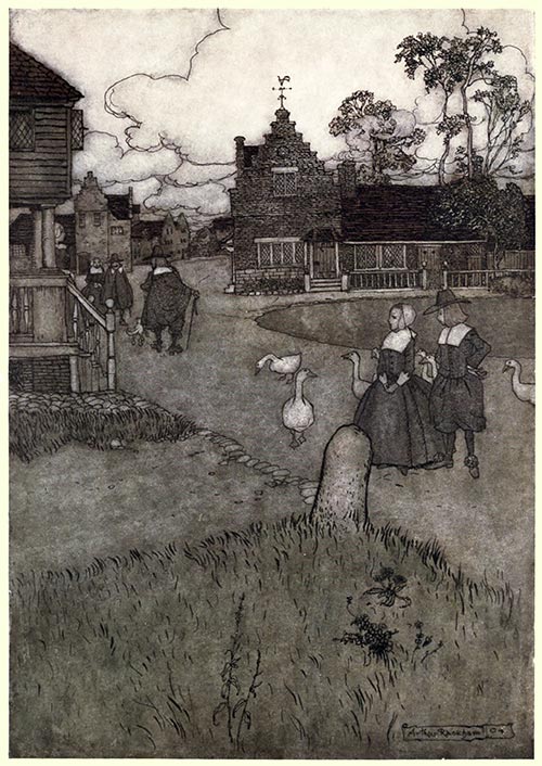 In that same village and in one of these very houses (which, to tell the precise truth, was sadly time-worn and weather-beaten), there lived, many years since, while the country was yet a province of Great Britain, a simple, good-natured fellow, of the name of Rip Van Winkle. He was a descendant of the Van Winkles who figured so gallantly in the chivalrous days of Peter Stuyvesant, and accompanied him to the siege of Fort Christina. He inherited, however, but little of the martial character of his ancestors. I have observed that he was a simple, good-natured man; he was, moreover, a kind neighbour, and an obedient, hen-pecked husband. Indeed, to the latter circumstance might be owing that meekness of spirit which gained him such universal popularity; for those men are apt to be obsequious and conciliating abroad, who are under the discipline of shrews at home. Their tempers, doubtless, are rendered pliant and malleable in the fiery furnace of domestic tribulation; and a curtain-lecture is worth all the sermons in the world for teaching the virtues of patience and long-suffering. A termagant wife may, therefore, in some respects, be considered a tolerable blessing; and if so, Rip Van Winkle was thrice blessed.