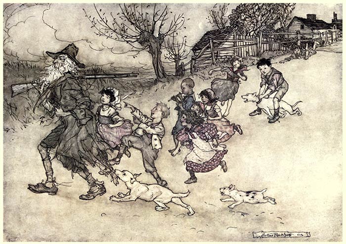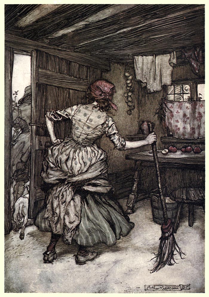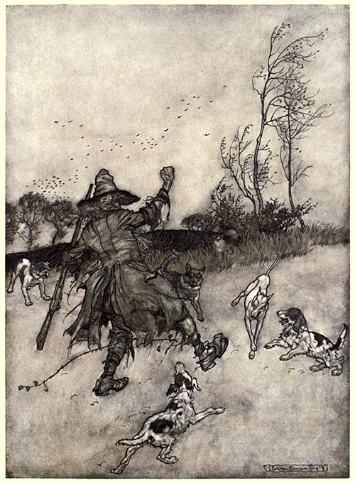 Rip’s sole domestic adherent was his dog Wolf, who was as much hen-pecked as his master; for Dame Van Winkle regarded them as companions in idleness, and even looked upon Wolf with an evil eye, as the cause of his master’s going so often astray. True it is, in all points of spirit befitting an honourable dog, he was as courageous an animal as ever scoured the woods—but what courage can withstand the evil-doing and all-besetting terrors of a woman’s tongue? The moment Wolf entered the house his chest fell, his tail drooped to the ground or curled between his legs, he sneaked about with a gallows air, casting many a sidelong glance at Dame Van Winkle, and at the least flourish of a broomstick or ladle he would fly to the door with yelping precipitation.