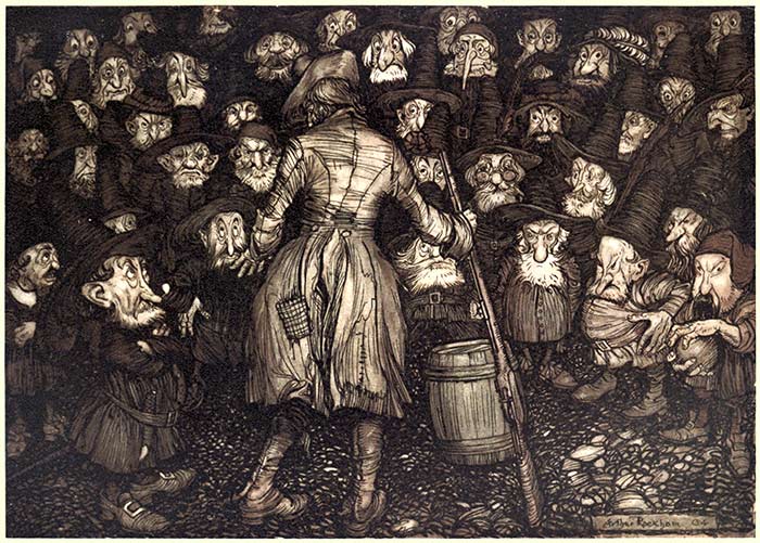 As Rip and his companion approached them, they suddenly desisted from their play, and stared at him with such fixed,14 statue-like gaze, and such strange, uncouth, lack-lustre countenances, that his heart turned within him, and his knees smote together. His companion now emptied the contents of the keg into large flagons, and made signs to him to wait upon the company. He obeyed with fear and trembling; they quaffed the liquor in profound silence, and then returned to their game.