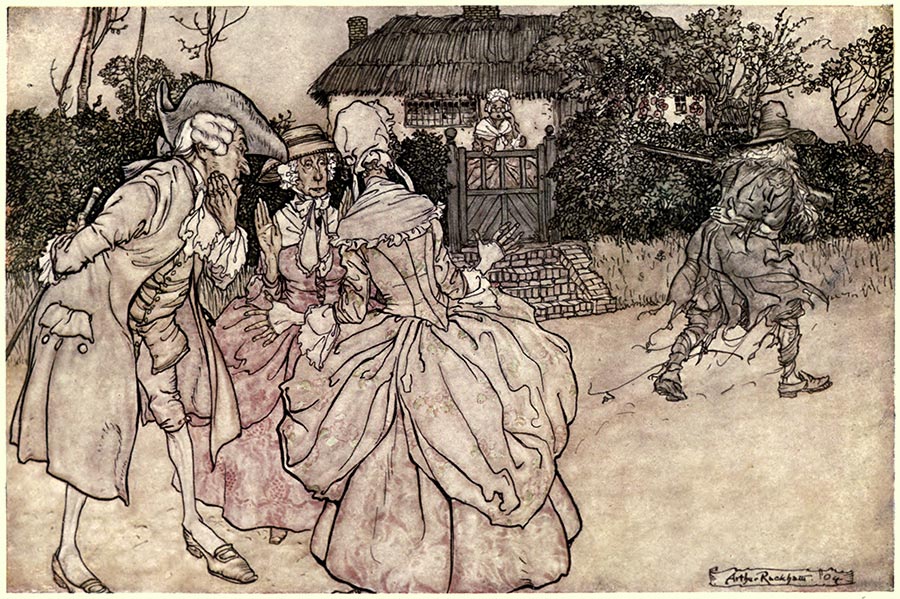 All stood amazed, until an old woman, tottering out from among the crowd, put her hand to her brow, and peering under it in his face for a moment, exclaimed: “Sure enough! it is Rip Van Winkle—it is himself! Welcome home again, old neighbour. Why, where have you been these twenty long years?”