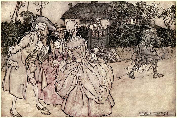 The appearance of Rip, with his long, grizzled beard, his rusty fowling-piece, his uncouth dress, and an army of women and children at his heels, soon attracted the attention of the tavern politicians. They crowded round him, eyeing him from head to foot with great curiosity. The orator bustled up to him, and, drawing him partly aside, inquired “On which side he voted?” Rip stared in vacant stupidity. Another short but busy little fellow pulled him by the arm, and, rising on tiptoe, inquired in his ear, “Whether he was Federal or Democrat?” Rip was equally at a loss to comprehend the question; when a knowing, self-important old gentleman, in a sharp cocked hat, made his way through the crowd, putting them to the right and left with his elbows as he passed, and planting himself before Van Winkle, with one arm akimbo, the other resting on his cane, his keen eyes and sharp hat penetrating, as it were, into his very soul, demanded in an austere tone, “What brought him to the election with a gun on his shoulder, and a mob at his heels; and whether he meant 19 to breed a riot in the village?” “Alas! gentlemen,” cried Rip, somewhat dismayed, “I am a poor quiet man, a native of the place, and a loyal subject of the king, God bless him!”