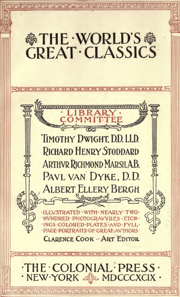 The publication of M. Taine's "History of English Literature," in 1864, and its translation into English, in 1872, mark an epoch in educational history, especially in that of America. Prior to the appearance of this work, the total knowledge of British writers gained in the school and college life of the ordinary American youth was generally derived in the form of blind memorization from one text-book. This book was a combination of minute biographical detail with the generalities and abstractions of criticism. The student, and the general reader as well, did not really study the great writers at all; he simply memorized what someone had written about them; and he tried, generally in vain, to comprehend the real concrete significance of such critical terms as "bald, nervous, sonorous," etc. But with the distribution of M. Taine's great work came the beginning of better things. It was the first step in an evolution by no means yet completed—a movement paralleled in the development of methods of scientific study during the last four decades. Forty years ago the pupil did not study oxygen, electricity, or cellulose; he simply memorized what someone had written about these elements. He never touched and rarely saw the things themselves, and he counted himself fortunate if his instructor had the energy and the facilities to perform before the wondering class a few stock experiments. But all this has been changed. It is now universally recognized that the only sound method of studying any science is the laboratory method; that is, the study of the thing itself in all its manifestations. In methods of studying literature the progress towards a true scientific, that is, a laboratory method, has been much slower, but it seems almost equally sure. We are just now in the intermediate stage, where we study "editions with notes." Our educators, as a rule, have yet to learn that to memorize biographical data and the mere generalities and negations of criticism, or to trace out obscure [Pg iii] allusions and doubtful meanings, is not to study a writer in any broad or fruitful sense. But the movement towards a true scientific method is already well begun; and, as we have said, to M. Taine belongs the honor of taking the initial step.