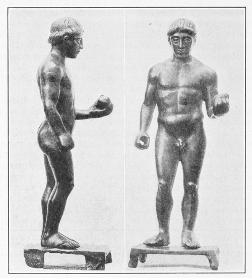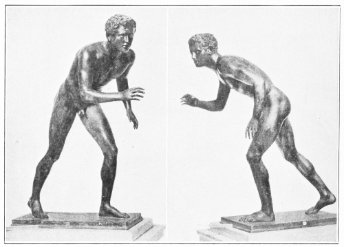 By using all such sources of information, it is possible to attain tolerable certainty in reconstructing the various types and poses of these lost monuments, and in identifying schools of athletic sculpture, masters, and even individual statues. But it must be stated at the outset that such identifications, from the very nature of the problem, are at best tentative in character. The attempt to see in Roman copies certain statues of athletes has often been made by archæologists. However probable such identifications may seem, we must not forget the simple fact that up to the present time not a single Roman copy has been conclusively proved to be that of an Olympic victor statue. Only as our knowledge of Greek sculpture is gradually extended by discoveries of additional works of art, and by future researches, will it be possible to attain an ever greater degree of probability. The further identification of these important monuments, as that of masterpieces of Greek sculpture generally, will thus remain one of the chief problems for the future archæologist. In the present book, where the body of material drawn upon is so immense and the scientific writings involved are so voluminous, manifestly the author can lay no claim to an exhaustive treatment. With due consciousness of the defects and shortcomings of the work, he can claim only to have made a small selection of such works of art as will best illustrate the various types of monuments under discussion.
