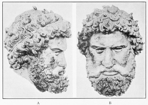 To the archæological sources, on the other hand, belong, first and foremost, the remnants of victor statues in stone and metal which have long been garnered in modern museums or have come to light during the excavation of the Altis. To this small number I hope I have added at least one marble fragment found at Olympia, the head of a statue by Lysippos, the last great sculptor of Greece (Frontispiece and Fig. 69). To this second kind of sources belong also the statue bases just mentioned, on many of which the extant footmarks enable us to determine the poses of the statues themselves which once stood upon them. Furthermore, an intimate knowledge of Greek athletic sculpture in all its periods and phases is, of course, essential in treating a problem of this nature. Here, as in the study of Greek sculpture in general, where the destruction of original masterpieces, apart from the few well-known but splendid exceptions, has been complete, we are almost entirely dependent upon second-hand evidence furnished by the numerous existing antique copies and adaptations of lost originals executed in marble and bronze by more or less skilled workmen for the Roman market.