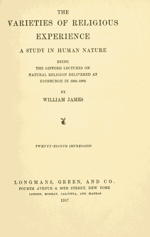 This book would never have been written had I not been honored with an appointment as Gifford Lecturer on Natural Religion at the University of Edinburgh. In casting about me for subjects of the two courses of ten lectures each for which I thus became responsible, it seemed to me that the first course might well be a descriptive one on “Man's Religious Appetites,” and the second a metaphysical one on “Their Satisfaction through Philosophy.” But the unexpected growth of the psychological matter as I came to write it out has resulted in the second subject being postponed entirely, and the description of man's religious constitution now fills the twenty lectures. In Lecture XX I have suggested rather than stated my own philosophic conclusions, and the reader who desires immediately to know them should turn to pages 511-519, and to the “Postscript” of the book. I hope to be able at some later day to express them in more explicit form.