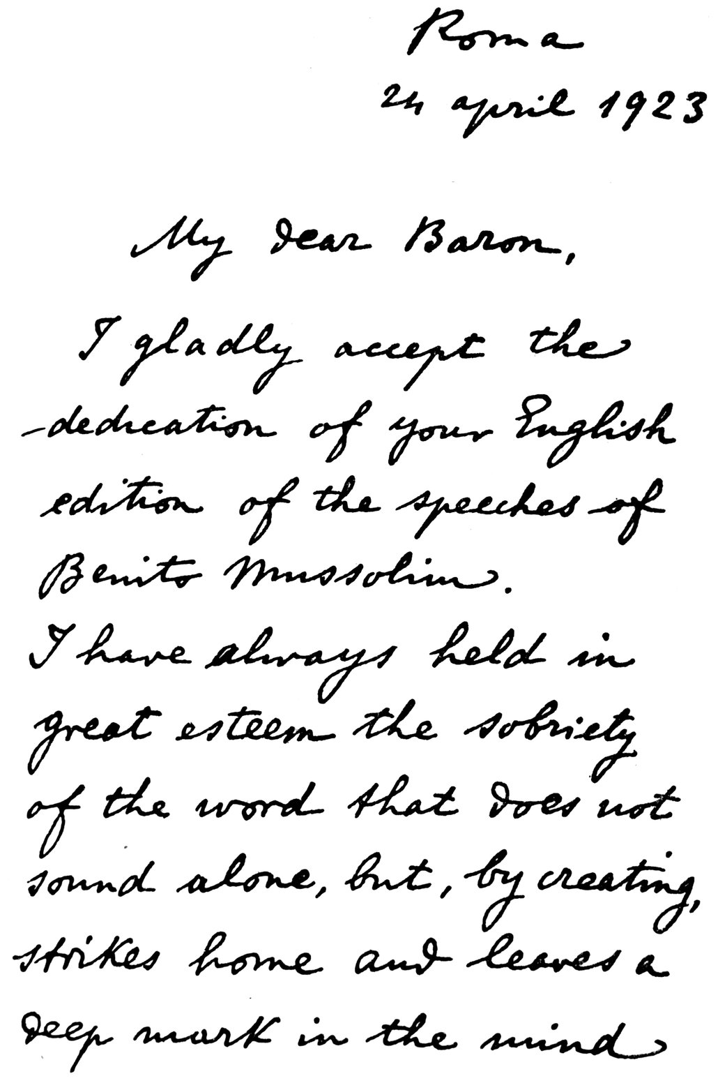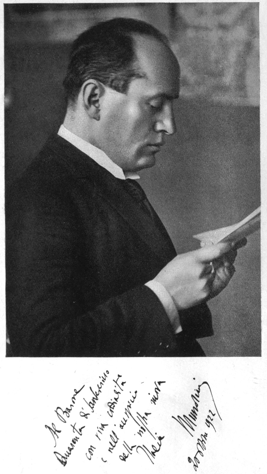 With no exaggeration it can be stated that since the advent to power of Mussolini every day has seen a steady advance in the direction of the rebuilding of the country within and a notable enhancement of our prestige abroad. His strenuous everyday work is inspired by an indomitable xviidetermination to make Italy worthy of the glories of Vittorio Veneto, strengthened and disciplined, and he will spare neither himself nor those around him in his attempt to bring about its realisation.