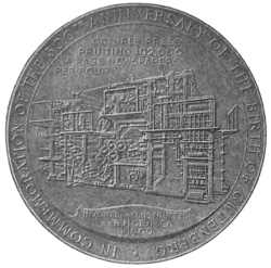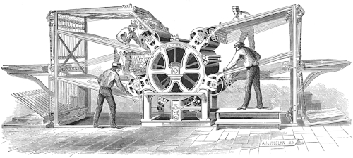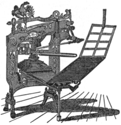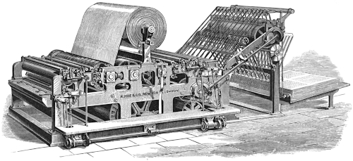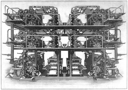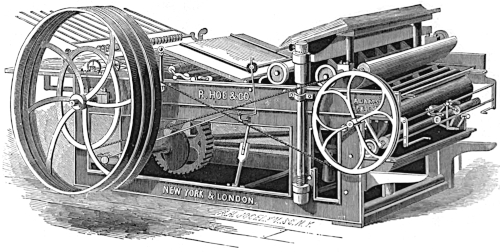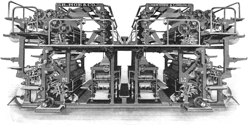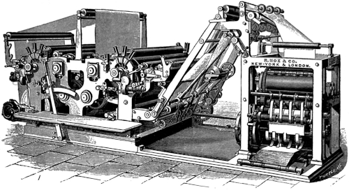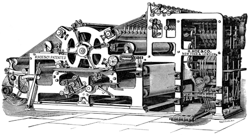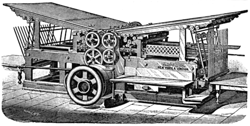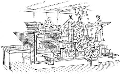 “The printing press is synonymous with progress, with the diffusion of knowledge and the spread of ideas. Without the great [66] improvements that have been made in it within the memory of many men now living the modern newspaper, the best friend of liberty, and the [67] greatest foe of tyranny, would be an impossibility. It has more than kept pace with the advancement in other departments of industry. In [68] 1829 the Washington Hand Press was introduced and regarded as quite a mechanical triumph. At its best it printed 250 impressions an hour on one side, or 125 complete newspapers of insignificant dimensions. Now, a little over sixty years later, a machine is brought out which, when the number of papers alone is compared, does 150 times as much work in the same time, and which, if the comparison is extended to the actual amount of printing done, does over 2,000 times as much work.”