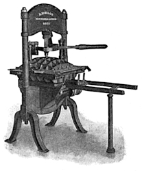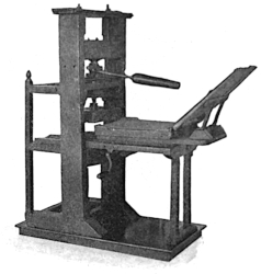 About the year 1450, Gutenberg was engaged in printing his first book from movable types. No method of taking the impressions simpler than that employed by him can be imagined, unless it be with a “buffer,” or by means of a brush rubbed over the paper laid upon the “form” of type, after the manner of the Chinese in printing from engraved blocks. His printing press consisted of two upright timbers, with cross pieces of wood to stay them together at the top and bottom. There were also intermediate cross timbers, one of which supported the flat “bed” upon which the type was placed, and through another a wooden screw passed, its lower point resting on the centre of a wooden “platen,” which was thus screwed down upon the type. After inking the form with a ball of leather stuffed with wool, the printer spread the paper over it, laying a piece of blanket upon the paper to soften the impression of the platen and remove inequalities. This was the machine which Gutenberg used. The mechanical principle embodied in it was found in the old cheese and linen presses ordinarily seen in the houses of medieval times.