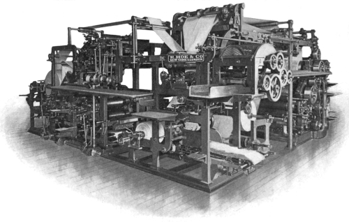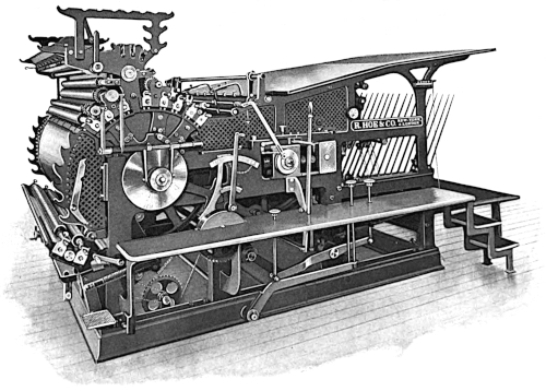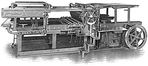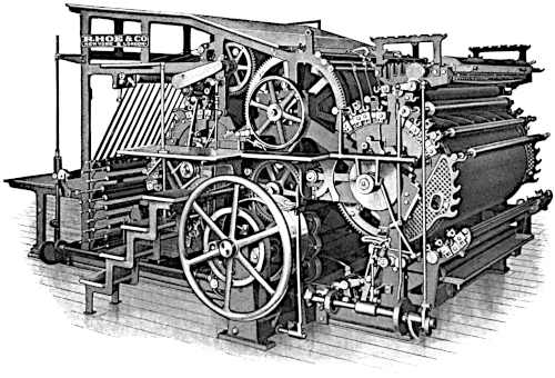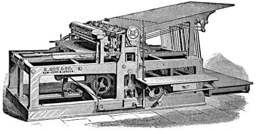 These folders, however, were only the commencement of a long series of experiments undertaken by the makers in the development of still faster printing and folding mechanisms, and from this time forward the progress made has been phenomenal. With great ingenuity, added to long experience, and by the acquisition and adaptation of every device which should aid them in their efforts, Hoe & Co. succeeded in providing machines of unrivalled designs, efficiency and speed.