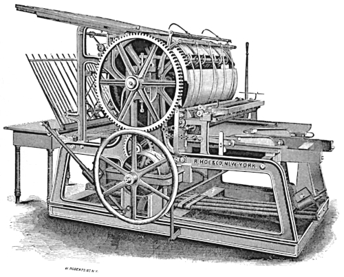 The news of these later inventions reached New York in due time, and in 1832 Robert Hoe, who had been some time established [18] in the manufacture of printing presses, sent a young man, Sereno Newton (whom he afterwards took in partnership with him), to England to investigate the subject and see what improvements were worthy of adoption. The result was the construction of the [19] machines known as the “Single Small Cylinder” and “Double Small Cylinder,” also the large Cylinder “Perfecting” Press, which have continued, with many alterations and improvements, to be manufactured up to the present time.