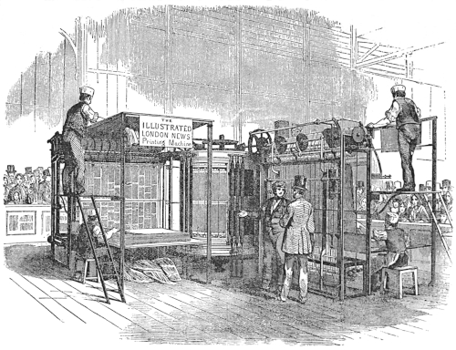 “Our readers will be startled to learn that it can print and fold [63] ninety thousand four-page ‘Heralds’ in an hour. This is, to the mind, which is not versed in the problem of rapid printing, a feat which makes Aladdin’s lamp an old woman’s fable. Ninety thousand per hour means fifteen hundred copies per minute, or twenty-five copies for every second of time ticked by the clock in Trinity’s steeple.