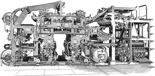 In the various experiments of Hoe & Co. bearing upon the manipulation of webs of paper some of their devices appeared to encroach upon patents secured by Luther C. Crowell, inventor, of Boston, who had made an ingenious machine for forming paper bags. These patents were immediately secured by purchase and the experimental work proceeded with the view of adapting some of them to [52] the requirements of the printing press. After many efforts, and the failure and destruction of several machines which had been [53] constructed at great expense, the Hoe “Double Supplement” machine was produced, the first one being purchased by James Gordon Bennett of [54] the New York “Herald” and put to work in his office. The result of these efforts has been, for a third time, a complete revolution of [55] the methods of fast newspaper printing. The most remarkable features of this machine are: Its extreme simplicity, considering the varied [56] work it performs, and its great speed, accuracy and efficiency. It turns out either four, six, eight, ten or twelve page papers at [57] 24,000 per hour, and sixteen page papers at 12,000 per hour; the odd pages being in every case accurately inserted and pasted in, and the [58] papers cut at top and delivered folded. This machine is constructed in two parts, the cylinders in one portion being twice the length of those in the other; the short cylinders being used for the supplements of the paper when it is desired to print more than eight pages. The plates being secured on the cylinders, the paper enters from the two rolls into the two portions of the machine, through each of which it is carried between the two pairs of type and impression cylinders, and printed on both sides, after which the two broad ribbons or “webs” pass over turning bars and other devices, by which they are laid evenly one over the other, and pasted together. The webs of paper then pass down upon a triangular “former,” which folds them along the center margin. They are then taken over a cylinder, from which they receive the final fold, a revolving blade within this cylinder projecting and thrusting the paper between folding rollers, while at the same moment a knife in the same cylinder severs the sheet, and a rapidly revolving mechanism, resembling in its motion the fingers of a hand, causes their accurate disposal upon traveling belts, which convey them on for final removal. From this rather summary description it will be apparent that the principle of retaining the paper in the web, or unsevered [59] form, up to the final fold and delivery, and performing all the operations without retarding the onward run of the paper, effectually prevents chokes or stoppages through any miscarriage of sheets severed before the folding. Several hundred of these machines have been made and put in operation by the United States; and in offices of the large newspapers in Great Britain and other countries.