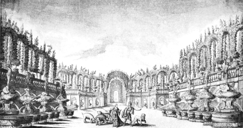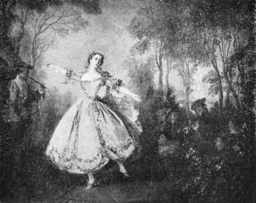 The scene represented a garden such as you see in so many of his paintings, and those of his school, primarily reminiscent of Pater’s “Conversation Galante” and Watteau’s “Fête Galante,” “L’amour au Théâtre Français,” and the “Terrace Party.” One of the young Court ladies reminded one of the central figure in the “Bal[291] sous une Colonnade.” A minuet was in progress. All was stately and dream-like, made the more so by the music.