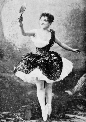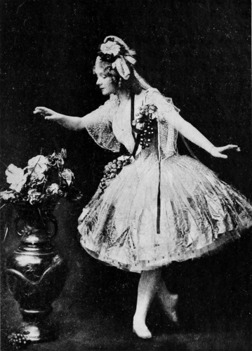 Dancers, of various schools, whether of the traditional ballet “school,” or otherwise, have quickly found their way into popular favour. Looking back over theatrical memories of the past twenty years or so, dance lovers will recall with pleasure seeing at the Palace Theatre that statuesque and extremely graceful dancer, Miss Mimi St. Cyr, in a delightful little miniature ballet, “La Baigneuse,” a dance-scena invented by Mr. George R. Sims, in which she lured to life the fountain-statue of a piping faun. Some will recall also a dancer of very different school, Miss Lottie Collins, whose “Tarrara-boom-de-ay” was a sensation in its way. Then, too, who that saw her could ever forget that electric dancer[310] hailing from Australia, Mlle. Saharet, who entered as on the wings of a whirlwind and, seeming all compact of