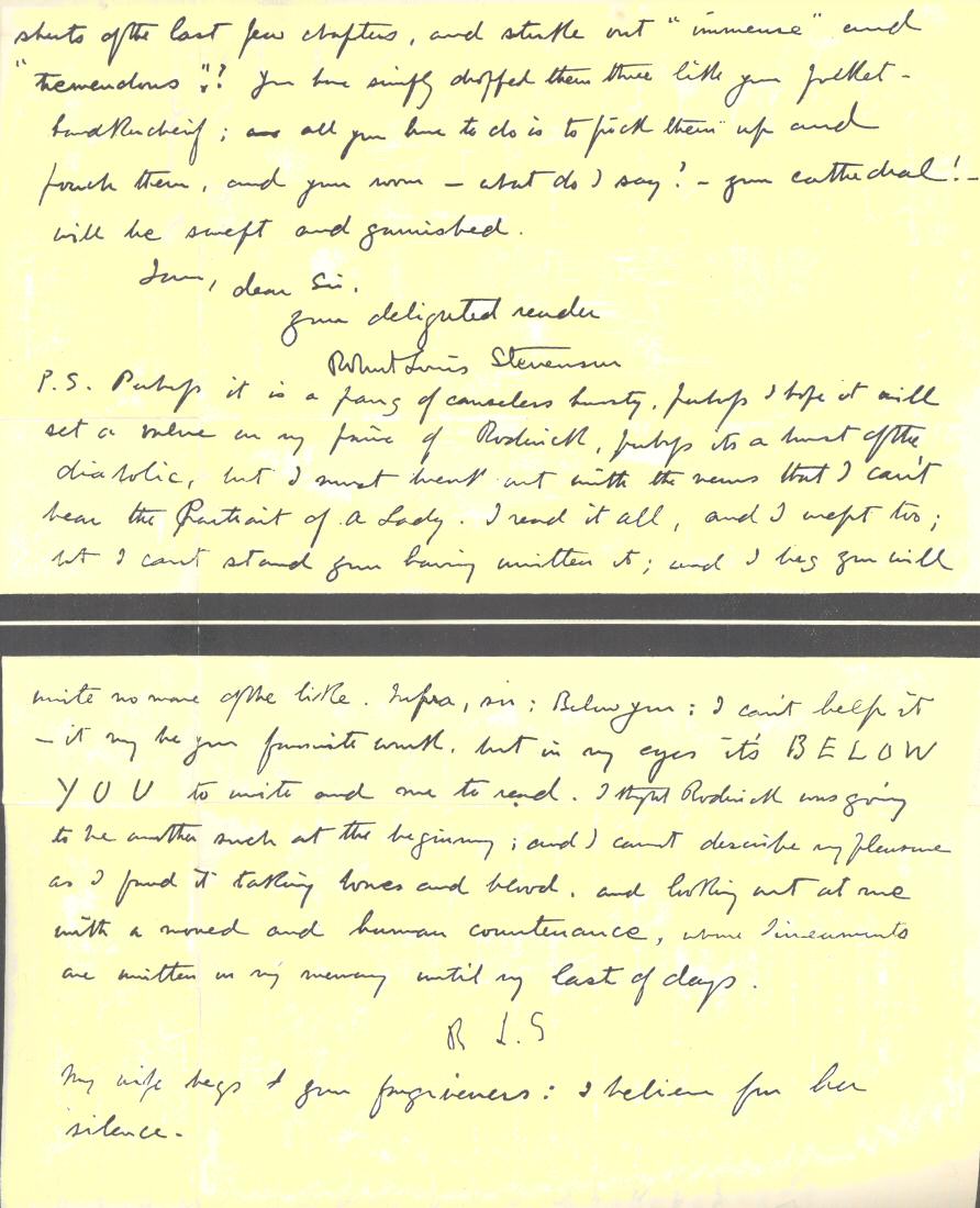 MY DEAR EELES,—The hand, as you will perceive (and also the spelling!), is Teuila’s, but the scrannel voice is p. 366what remains of Tusitala’s. First of all, for business. When you go to London you are to charter a hansom cab and proceed to the Museum. It is particular fun to do this on Sundays when the Monument is shut up. Your cabman expostulates with you, you persist. The cabman drives up in front of the closed gates and says, ‘I told you so, sir.’ You breathe in the porter’s ears the mystic name of Colvin, and he immediately unfolds the iron barrier. You drive in, and doesn’t your cabman think you’re a swell. A lord mayor is nothing to it. Colvin’s door is the only one in the eastern gable of the building. Send in your card to him with ‘From R. L. S.’ in the corner, and the machinery will do the rest. Henry James’s address is 34 De Vere Mansions West. I cannot remember where the place is; I cannot even remember on which side of the park. But it’s one of those big Cromwell Road-looking deserted thoroughfares out west in Kensington or Bayswater, or between the two; and anyway, Colvin will be able to put you on the direct track for Henry James. I do not send formal introductions, as I have taken the liberty to prepare both of them for seeing you already.