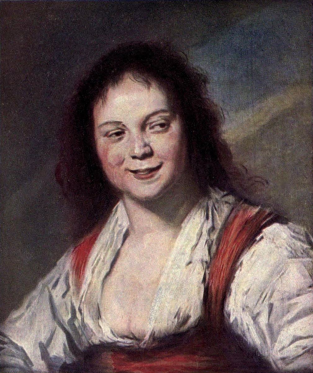 the mouth is smiling. She wears a dark-green dress with golden-brown