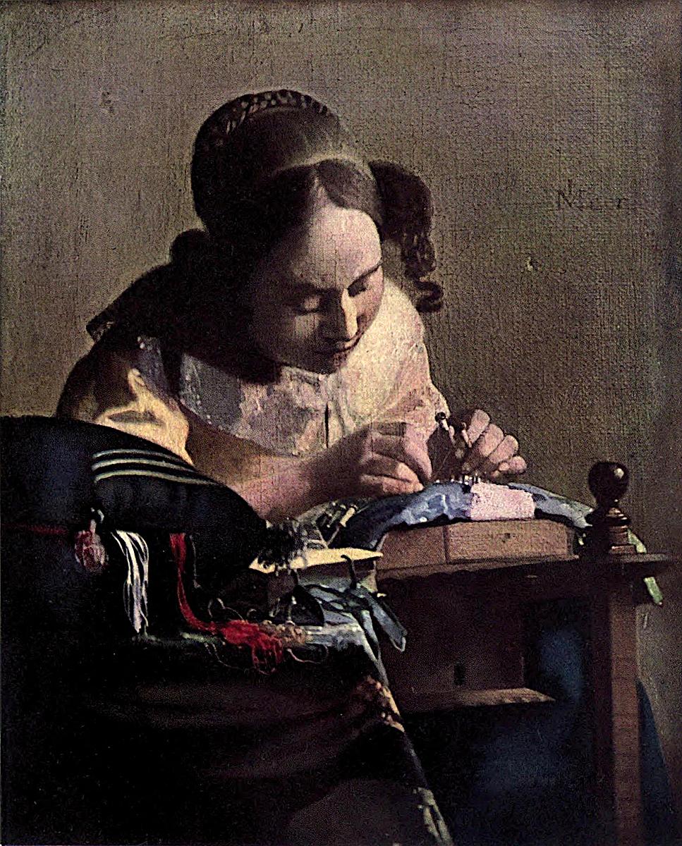 sleeves; a dark cloak is draped over her shoulders. The background is