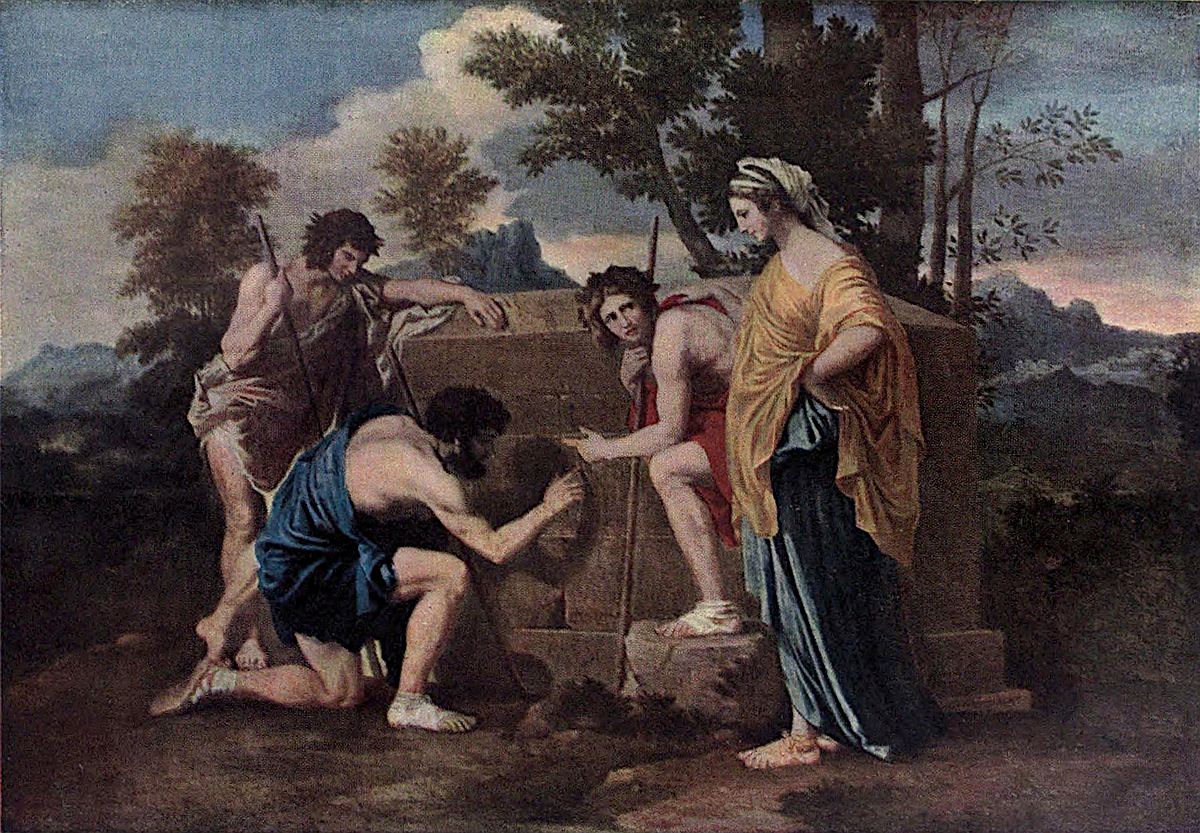 A nude figure of a fair-haired young maiden stands facing the spectator, the background being formed by a perpendicular rock partly overgrown with clinging plants. She raises her right arm over her head to hold the foot of a tilted vase, the mouth of which is supported by her left hand, and from which issues a streamlet of water that falls into a pool at the base of the rock, in which are reflected the feet of the maiden.